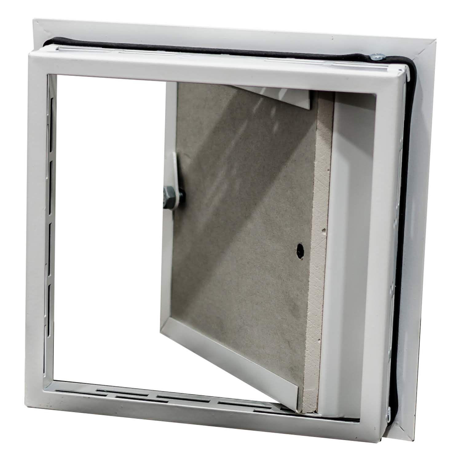 • Tapa con recubrimiento de exterior de acero galvanizado electropintado blanco con interior compuesto de aislación y placa de yeso-cartón o volcanita